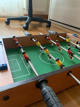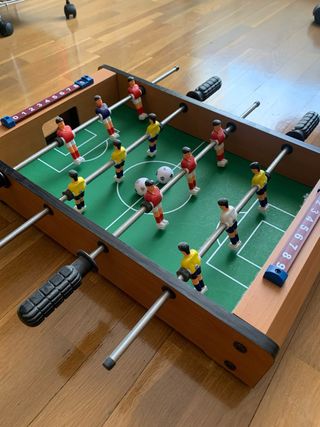 Futbolín de madera de tamaño reducido, perfecto para llevar la diversión a cualquier lugar. Ideal para partidas rápidas y para los más jóvenes. - Construcción en madera. - Incluye jugadores y pelotas.