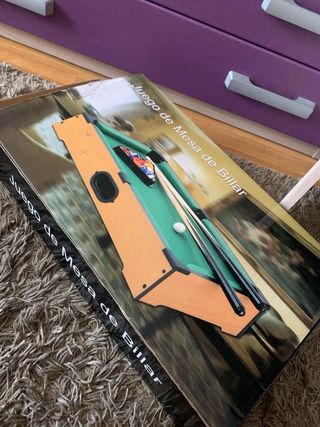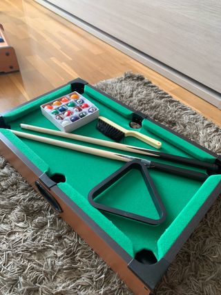 Juego de mesa de billar compacto, ideal para entretenimiento en casa. Incluye todos los elementos necesarios para empezar a jugar. - Mesa de billar verde con detalles en madera. - Juego completo de bolas de billar numeradas. - Dos tacos de billar. - Triángulo para colocar las bolas. - Cepillo para limpiar el paño.
