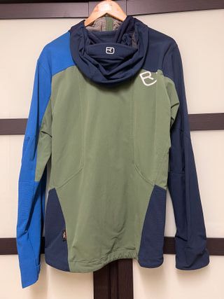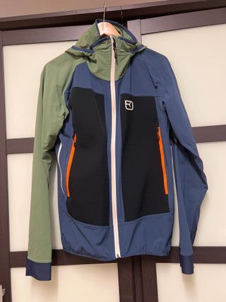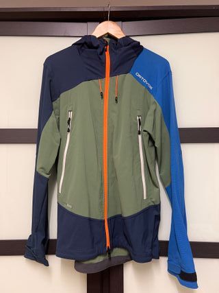 Chaqueta Ortovox de material soft shell en talla L. Diseño moderno con paneles en contraste y cremalleras de colores vivos. - Color principal azul marino. - Paneles laterales y frontales en negro. - Mangas y capucha en verde oliva. - Cremalleras naranjas y blancas.