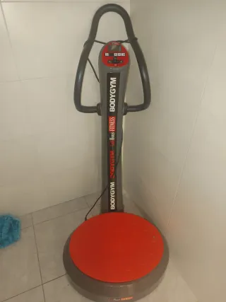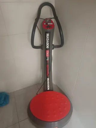 Plataforma vibratoria Bodygym con asas y pantalla digital. Ideal para el ejercicio en casa. - Color principal gris con detalles en rojo. - Diseño vertical con barra de agarre superior. - Base circular para el ejercicio.