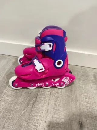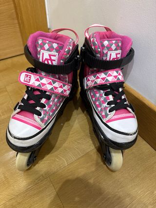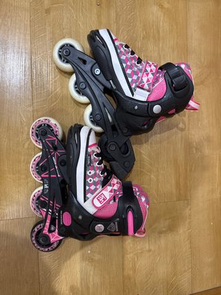 Patines en línea infantiles con diseño de Hannah Montana. Están en buen estado, con algunas señales normales de uso. - Diseño llamativo de Hannah Montana. - Ideales para principiantes. - Son ajustables.