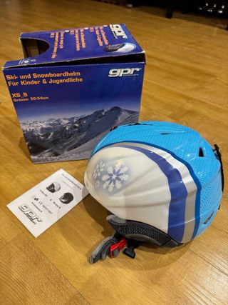 Casco de esquí y snowboard GPR para niños y jóvenes. Diseño azul con detalles blancos y copos de nieve. - Talla: XS-S (50-54cm). - Certificación CE EN1077:2007. - Está como nuevo - en su caja