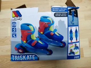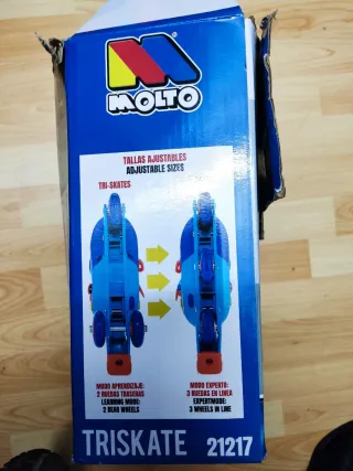 Patines en línea Molto Triskate, ideales para aprender y progresar. Diseñados para ofrecer seguridad y diversión. - Talla: 31-34 - Edad recomendada: +3 años - Modo aprendizaje: 2 ruedas traseras - Modo experto: 3 ruedas en línea - Evolutivos -Falta el perno para ponerlo de línea a 2+1, pero fácil de encontrar