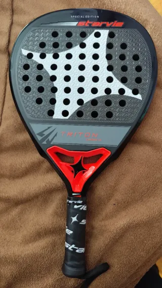 Pala de pádel Starvie Triton Carbon, edición especial. - Diseño con estrella blanca y detalles en rojo. - Superficie con agujeros. - Grip negro con logo Starvie.