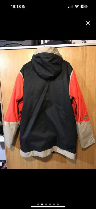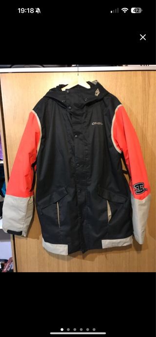 Chaqueta de snowboard de la marca O'neil. Talla xl . 10k - Diseño en color negro con mangas en naranja y gris. - Capucha integrada. - Cierre frontal con botones. - Dos bolsillos delanteros.