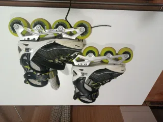 Patines en línea de la marca Oxelo. - Diseño deportivo en blanco y negro. - Ruedas de color amarillo. - Cierres de velcro y hebilla.