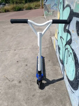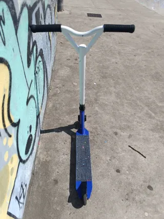 Patinete Grit Edition 3, tiene la lija y las ruedas cambiadas. - Manillar blanco. - Puños negros. - Base azul con diseño blanco.