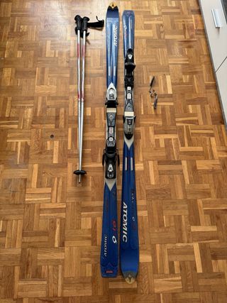 Conjunto de esquís Atomic de color azul con bastones. - Esquís Atomic. - Bastones de esquí. -tamaño 180 centímetros y uno tiene dañado los ganchos de freno de resto funciona perfectamente perfecto para alguien que esta aprendiendo