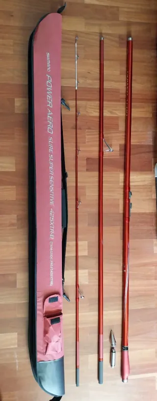 Caña de surfcasting Shimano Power Aero 425 en color rojo. Usada dos veces. - Caña de pesca de tres tramos. Con dos contrapesos. - Incluye funda de transporte. - Punta de la caña de color blanco. NO ENVIO, ENTREGA EN PERSONA.