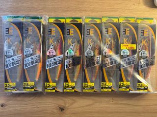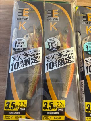 Lote de señuelos de pesca Yamashita EGI-OH K, edición especial 10 aniversario. - Tamaño 3.5, 22g. - Colores variados: SUNSUN GOLD, NBB, RED. - Edición limitada Meister's Edition.