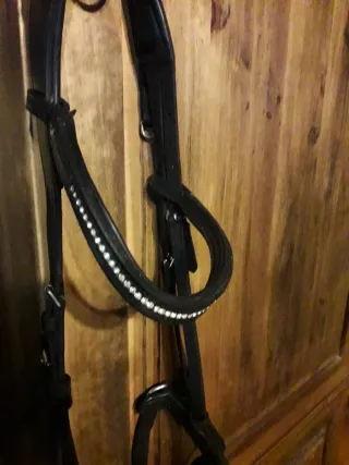 Cabezada de montar de cuero negro, ideal para doma clásica. - Diseño elegante con detalles brillantes en la testera. - Hebillas metálicas para ajuste. - Riendas incluidas. - Muserola y testera ancha.
