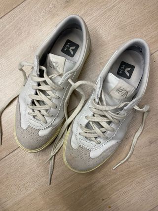 Zapatillas Veja Volley de piel en color blanco y detalles en ante. - Exterior de piel. - Paneles de ante. - Suela de goma. - Cierre con cordones. Suela piel sin rozaduras. La zapatilla izquierda tiene un desgastado interior en la Zona del talon.
