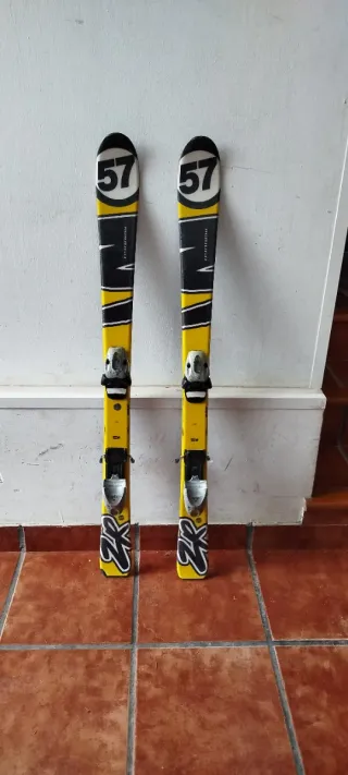 Esquís de 110 cm con un diseño llamativo en amarillo y negro. - Número 57 en la parte superior. - Fijaciones incluidas.