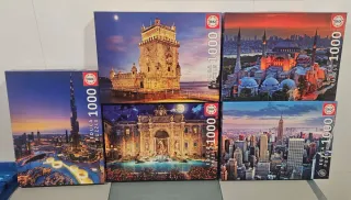 Lote de puzzles de la marca Educa con 1000 piezas cada uno. Las imágenes son de monumentos y ciudades. - Puzzle 1: Torre de Belém, Lisboa. - Puzzle 2: Hagia Sophia, Estambul. - Puzzle 3: Fontana di Trevi, Roma. - Puzzle 4: Skyline de Dubai. - Puzzle 5: Skyline de Nueva York.