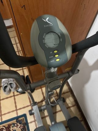 Bicicleta estática de la marca Domyos, ideal para entrenamientos en casa. Cuenta con un monitor digital para seguir tu progreso. - Monitor con pantalla LCD. - Funciones: Distancia, Velocidad, Tiempo, Calorías y Pulso. - Botones de control: UP, DOWN, MODE.