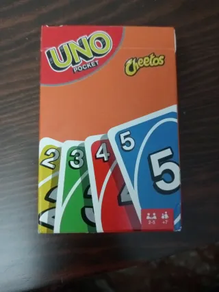 Baraja de cartas UNO Pocket con temática de Cheetos. - Diseño compacto para llevar a todas partes. - Incluye cartas de juego. - Ideal para 2-5 jugadores.