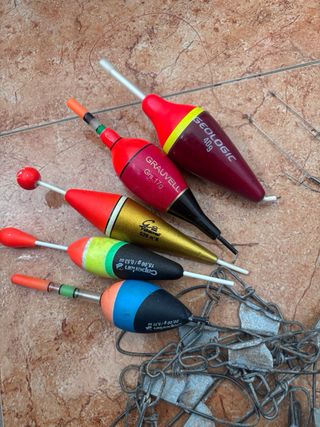 Conjunto de aparejos de pesca que incluye cinco flotadores de diferentes colores, una cadena con pesos y varios anzuelos. PRECIO NO NEGOCIABLE - Cinco flotadores para la pesca con pez vivo. - Cadena stringer porta peces. - 2 montajes de pez vivo (1 de ellos con bajo de keblar) - 3 poteras grandes - varios cables de acero Palabras clave: pesca, lucio, black bass, siluro, depredador, costa, surf casting