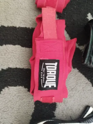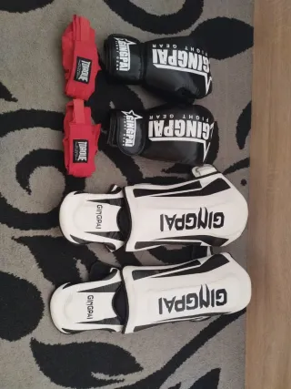 Pack completo de equipamiento para Muay Thai. - Guantes de boxeo GINGPAI negros. - Tibiales GINGPAI blancos y negros. - Vendas de mano TORQUE rojas.