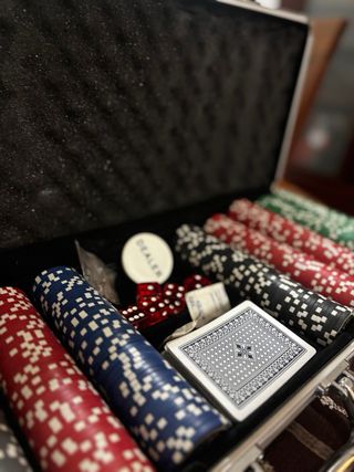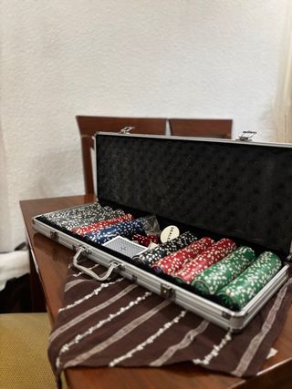 NO NEGOCIABLE maletín de póker estilo casino en muy buen estado. Perfecto para partidas en casa con amigos. 🧳 Incluye: • Maletín de aluminio resistente con llave incorporada • 500 fichas profesionales de póker • 1 baraja de cartas • 5 dados • 1 ficha de dealer El interior está acolchado y las fichas están en muy buen estado, como se ve en las fotos. El maletín cierra perfectamente y es ideal para transportar y guardar todo de forma segura.