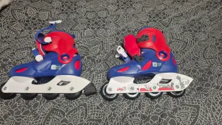 Patines en línea de color azul y rojo, con detalles blancos y diseño de ciudad. - Cierre de velcro y hebilla. - Ruedas Oxelo. - Talla ajustable..
