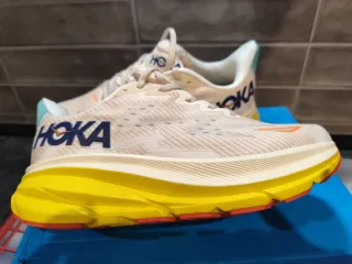 Zapatillas deportivas HOKA de la talla 40 listas para estrenar. Diseño moderno y cómodo. - Diseño unisex. - Color blanco con detalles en amarillo y azul. - Parte superior de malla transpirable, super ligeras. - Suela amortiguada. - Detalle del logo en los laterales. Son originales.