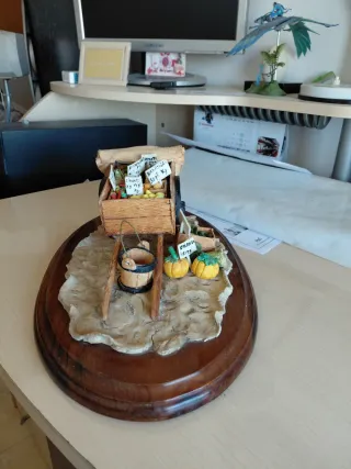 Detallado carro de manualidades con temática de mercado. - Incluye varios productos como pimientos, alcachofas, tomates, naranjas, limones, calabazas y repollos. - Cada producto tiene un cartel con su nombre y precio. - El carro está montado sobre una base de madera ovalada.