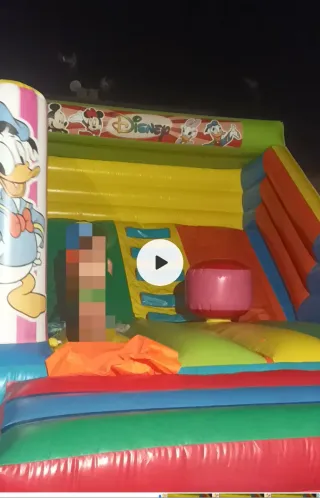 Castillo hinchable con temática de Disney, con los personajes de Mickey y Minnie Mouse. - Diseño colorido con tobogán y obstáculos. - Ideal para fiestas y eventos infantiles. - Fabricado con materiales resistentes.