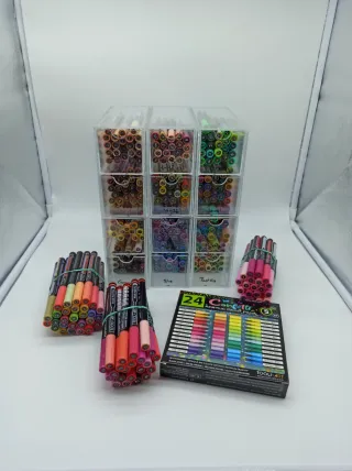 Set de rotuladores acrílicos de la marca Tooli-Art. - Incluye: Rotuladores tonos Earth, confetti, Pink, purple, greens, red, Brown, grays, skin, yellows, jewel, wildflower, pastels, metalic. Puntas para poder cambiar. Tres metacrilatos de 4cajoncitos cada uno para guardarlos. Paletas de colores ya hechas
