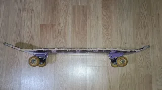 Monopatín con lija. Esta usado pero funciona bien. - Superficie de lija negra. - Forma ovalada. - Parte de atrás con dibujo. 79 cm de largo