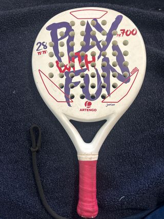 Raqueta de pádel junior de la marca Artengo, modelo PR 700. Diseñada para niños. - Color blanco con detalles en morado y rojo. - Mango rosa - Medida de 28 mm. - Incluye cordón de seguridad negro.