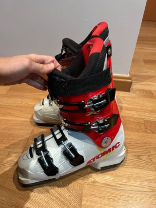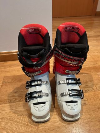 Botas de esquí Atomic Pro RS para niño. Diseñadas para ofrecer comodidad y rendimiento en la nieve. - La talla equivale aprox a un 36 o 36.5 - Cierre con 4 ganchos. - Interior acolchado ASY PRO. - Color blanco y rojo.
