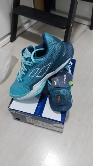 Talla 42 . Zapatillas de tenis Babolat Jet Mach 3 suela clay / espiga, para superficie de tierra batida o padel, diseñadas para ofrecer rendimiento y comodidad en la pista. - Color azul y turquesa. - Suela Michelin. - Tecnología OrthoLite.