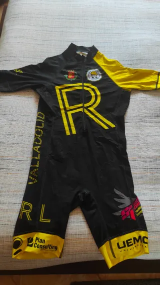 Maillot de patinaje con diseño llamativo. - Mangas de color amarillo. - Cremallera frontal. - Inscripciones VALLADOLID y R L en amarillo. - Logos de Plan Consulting y UEMC UNIVERSITA en la parte inferior. - Detalle de alas y logo SF en la pierna derecha.
