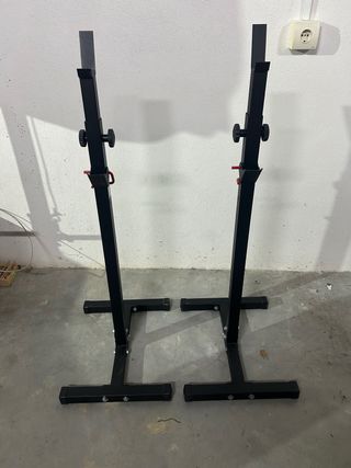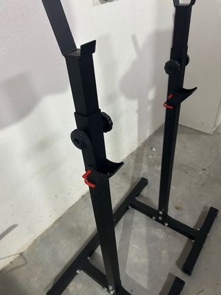 Par de soportes para barra de pesas, marca K Sport. Compradas en octubre 2024. Tengo factura - Estructura metálica negra. - Altura ajustable con perillas. - Base estable y resistente.