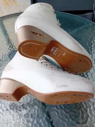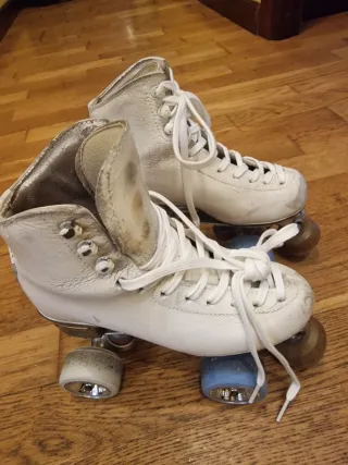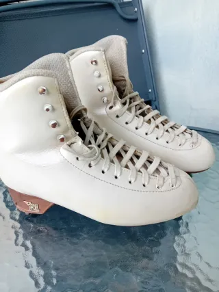 Se venden patines de patinaje artístico en color blanco, talla 225 (33/34). Ideales para iniciarse en el patinaje artístico. - bota risport laser - plancha boiani star rk 13 - ruedas giotto d47/d49 La bota derecha tiene un poco pelado el forro.