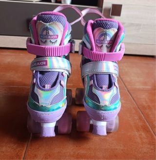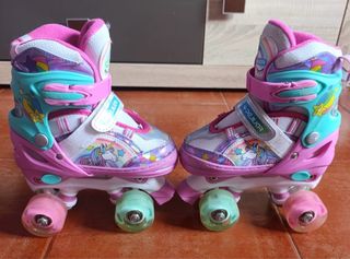 Estos patines infantiles presentan un divertido diseño de unicornio. Están usados pero en muy buen estado. - Color morado, rosa y blanco. - Cierre de lengüeta y de velcro, se pueden poner cordones. - Ruedas de goma en buen estado que lucen al moverse. - Talla ajustable 30-33. Nuevos sobre 60 euros, No regateos.