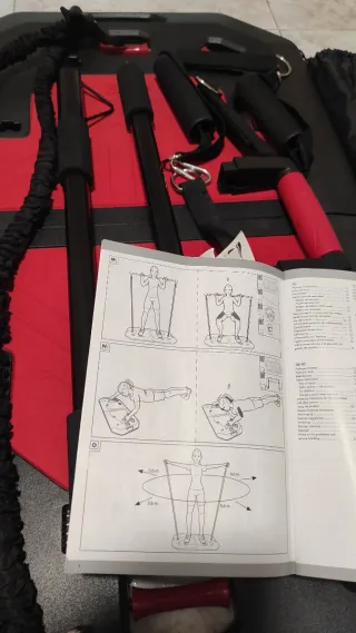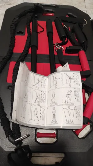 Tabla de entrenamiento portátil con accesorios para ejercitar todo el cuerpo. Incluye manual de instrucciones con ejercicios. - Bandas de resistencia negras. - Mangos ergonómicos. - Dos barras de soporte.