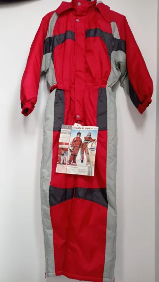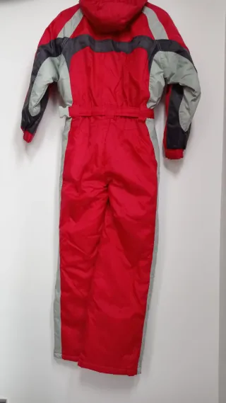Mono de esquí de una pieza para niños de 12 años. Ideal para disfrutar de la nieve con comodidad y protección. - Diseño en color rojo, gris y negro. - Cierre frontal con cremallera y botones. - Con capucha. - Puño con elástico, cierre velcro y cortavientos adicional. - Cuello interior con lana.