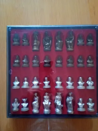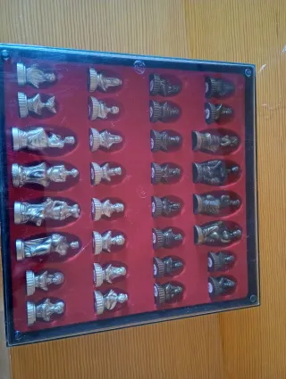 Set de ajedrez con figuras de bronce, ideal para coleccionistas. - Piezas detalladas con diseño clásico. - Base de las figuras con acabado metálico.