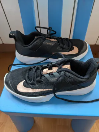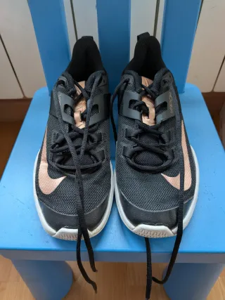 Zapatillas deportivas Nike Vapor en color negro y detalles en oro - número 38 - Están como nuevas , muy poco uso como se puede ver en las fotos tanto en la suela como en la zapatilla en general - Diseño moderno y ligero. - Cierre con cordones. - Logo de Nike en el lateral