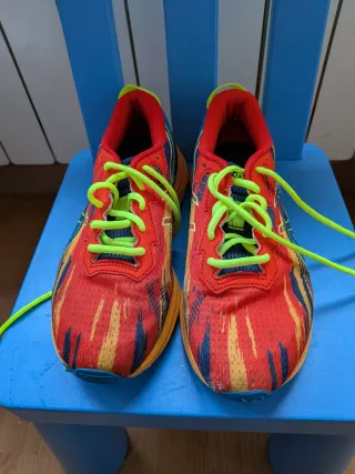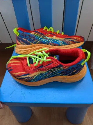 Zapatillas deportivas Asics para running con un diseño llamativo. - talla 37'5 - Están prácticamente sin usar , como se puede ver en las fotos están como nuevas - Parte superior de malla transpirable. - Cordones de color verde neón. - Suela de goma para mayor agarre. - Detalle de rayas en rojo, azul y amarillo