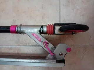 Patinete infantil con manillar ajustable y freno. -del decathlon, 0xelo. - Color blanco y detalles en rosas - Empuñaduras de goma para un mejor agarre. - Ruedas con detalles en color rosa. -plegable y ajustable. -100 kl.max.