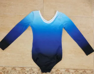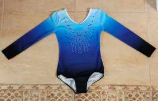 Maillot de gimnasia para niña de 8 años con un diseño degradado en tonos azules y detalles brillantes. - Manga larga. - Diseño ombré azul. - Adornos de pedrería en el escote. - Perfecto estado, completo con todos los brillantes