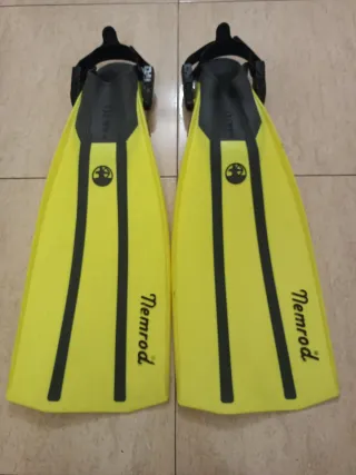 Aletas de buceo de color amarillo brillante en muy buen estado,marca Nemrod. Diseñadas para ofrecer comodidad y rendimiento. Talla S-M - Aletas de buceo. - Color amarillo con detalles en gris. - Marca: Nemrod. - Tiras ajustables con hebillas. Pesca, submarinismo, snorkel,mar,playa, arpón,ballesta