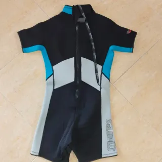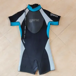 Neopreno Mares Tropic de manga corta y pernera corta. - Largo: 38 cm - Anchura sisa a sisa: 74 cm - Grosor de 2.5mm. - Color principal negro con detalles en azul y gris. - Cierre de cremallera trasera con cordón para poder cerrarla. - Logo de Mares en el pecho y manga. En perfecto estado