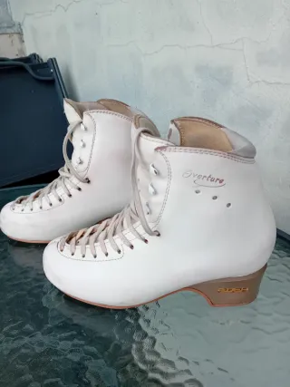 Patines de patinaje artístico Edea Overture. Usado dos temporadas , bastante rayados pero con buen uso interior la bota. - Talla 38 (255). - Color blanco. - Cierre con cordones.