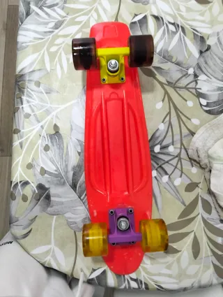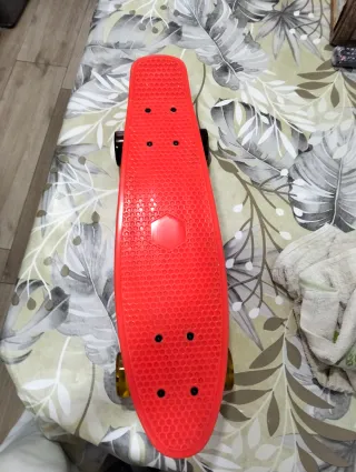 Monopatín de color rojo con ruedas amarillas. - Superficie antideslizante. - Ruedas de poliuretano. - Ejes de metal.