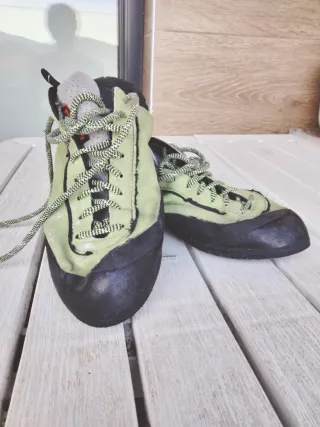 Zapatillas de escalada Five Ten Anasazi. Recién resoladas. Solo usadas en una vía. Las tenía olvidadas y pensaba usarlas para entrenar en el roco, pero me aprietan demasiado y ya no me apetece sufrir. La tela y las costuras están en buen estado a pesar de los años que tienen. Siguen siendo buenos gatos. - Color verde y negro. - Cierre con cordones.