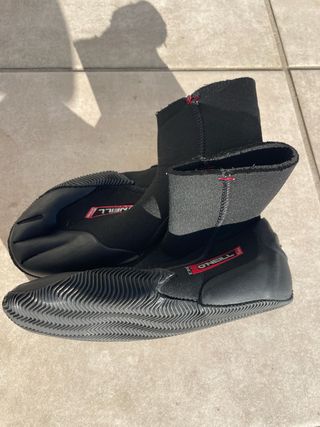 Botas de neopreno para surf. 2 usos. 5mm talle 8 aunque la etiqueta marca talla 9. Precio nuevo 84,90€. - Color negro. - Cierre con velcro. - Suela de goma. - Logo de la marca en el lateral.