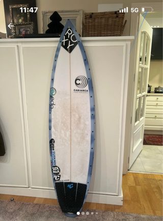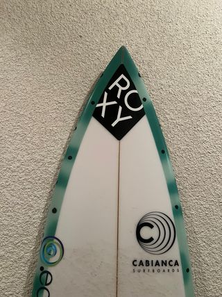 Tabla de surf Cabianca , medidas en una de las fotos.tiene un toque en el culo de la tabla como se ve en la ultima foto . - Logo ROXY en la punta. - Pegatinas de EDP y Basque Team. - Logo de Oakley en la parte inferior. - Tailpad con diseño C.